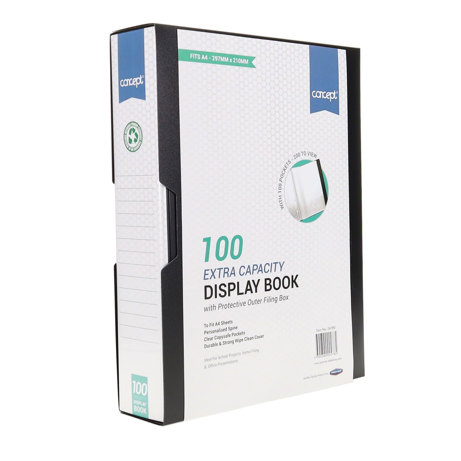 The Concept Display Book supplied in Black has a matte finish, is lightweight with a wipe clean cover. It's personalised spine makes it easy to label to help keep your files organised and easy to find. It features an easy file insert feature and has crystal clear internal pockets. Perfect for holding Notes, Paper, Projects, Documents and Certificates.